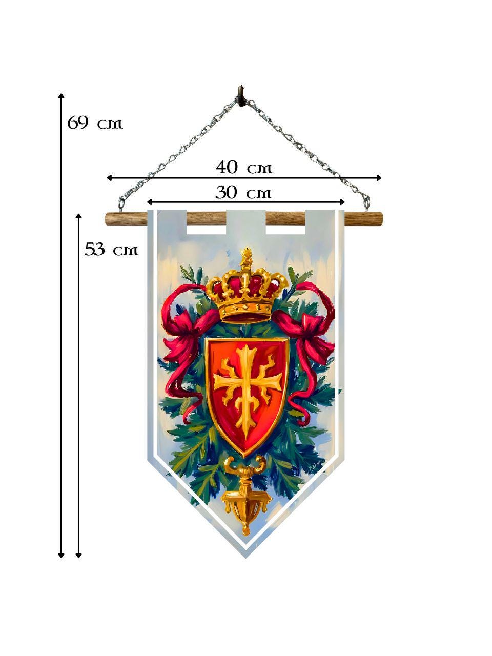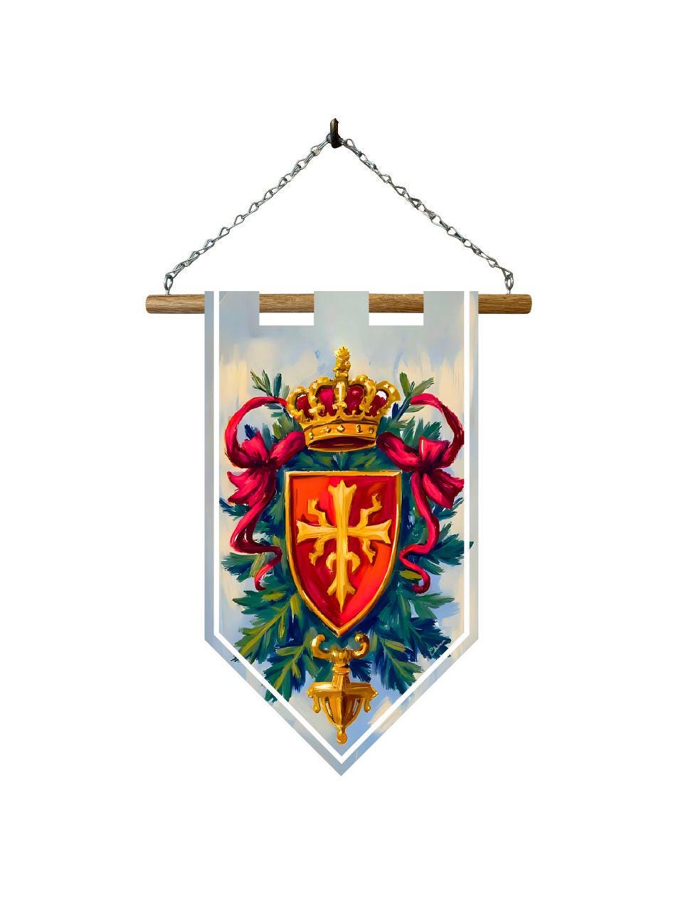 Ajoutez une ambiance médiévale et royale à votre intérieur avec cet étendard blason couronne royale représentant une croix dorée sur fond rouge entourée de feuillages et surmontée d’une couronne majestueuse.