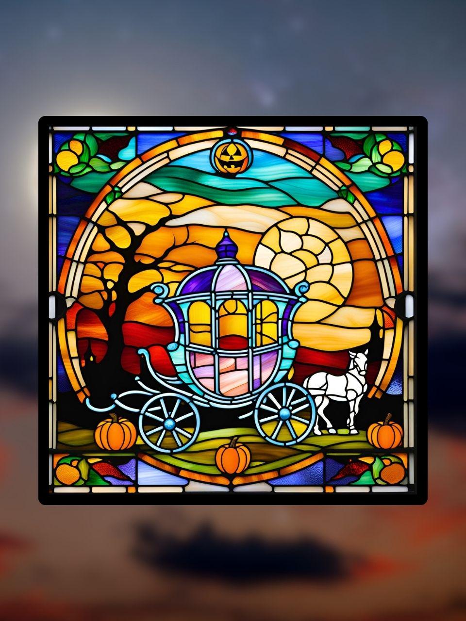 Vitrail Carrosse Citrouille d’Halloween – Décoration de Vitre Enchantée – Cadeau Original pour Passionnés de Contes Fantastiques