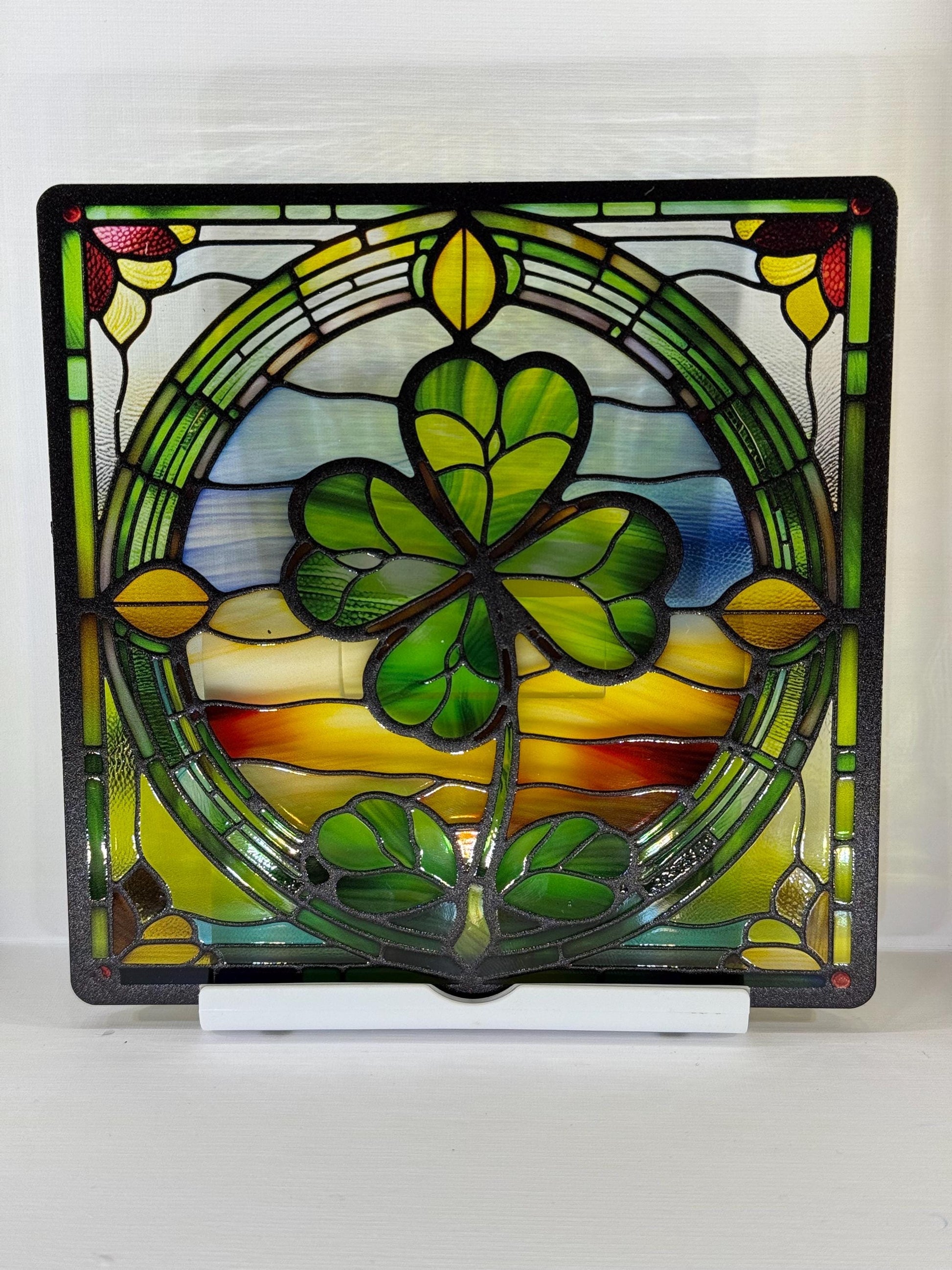Apportez une touche de chance à votre intérieur avec ce vitrail représentant un trèfle à quatre feuilles, symbole universel de porte-bonheur.