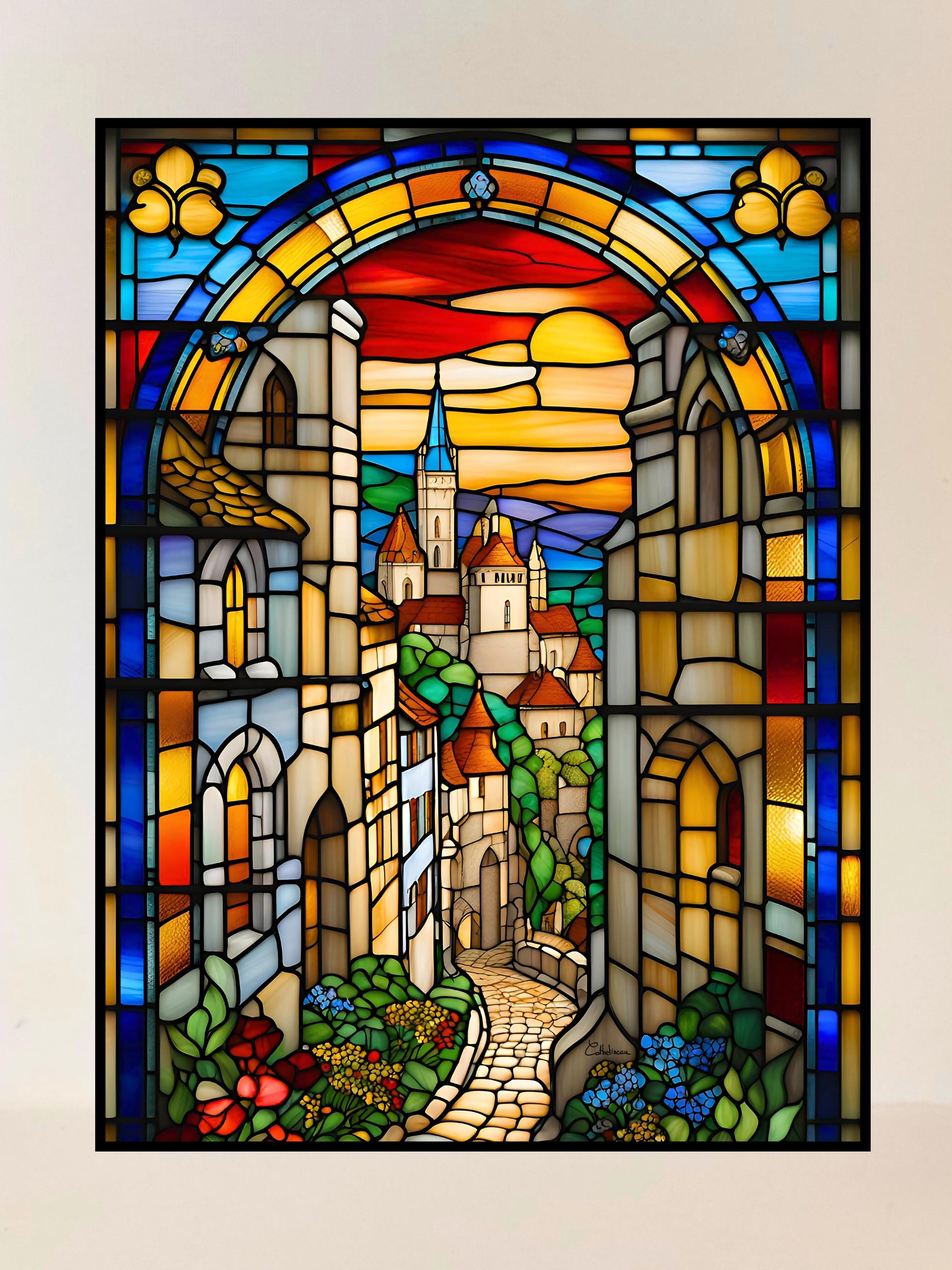 Apportez une touche d'histoire à votre intérieur avec ce vitrail représentant un village médiéval.